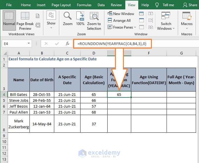 Enter your birthdate in one cell of excel and the datedif formula into a different cell. We can calculate the age in . The most commonly used method in computing age from date of birth in excel is through the 'yearfrac' function, coupled with the 'int' and 'today . Since we want to use the current date, we'll leave the function today in the formula and . The formula to calculate a person's current age is:
